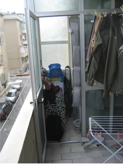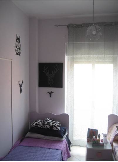 Al suo interno, l'appartamento è composto da un open space (soggiorno/cucina), due camere da letto, un servizio igienico, un disimpegno e due balconi.